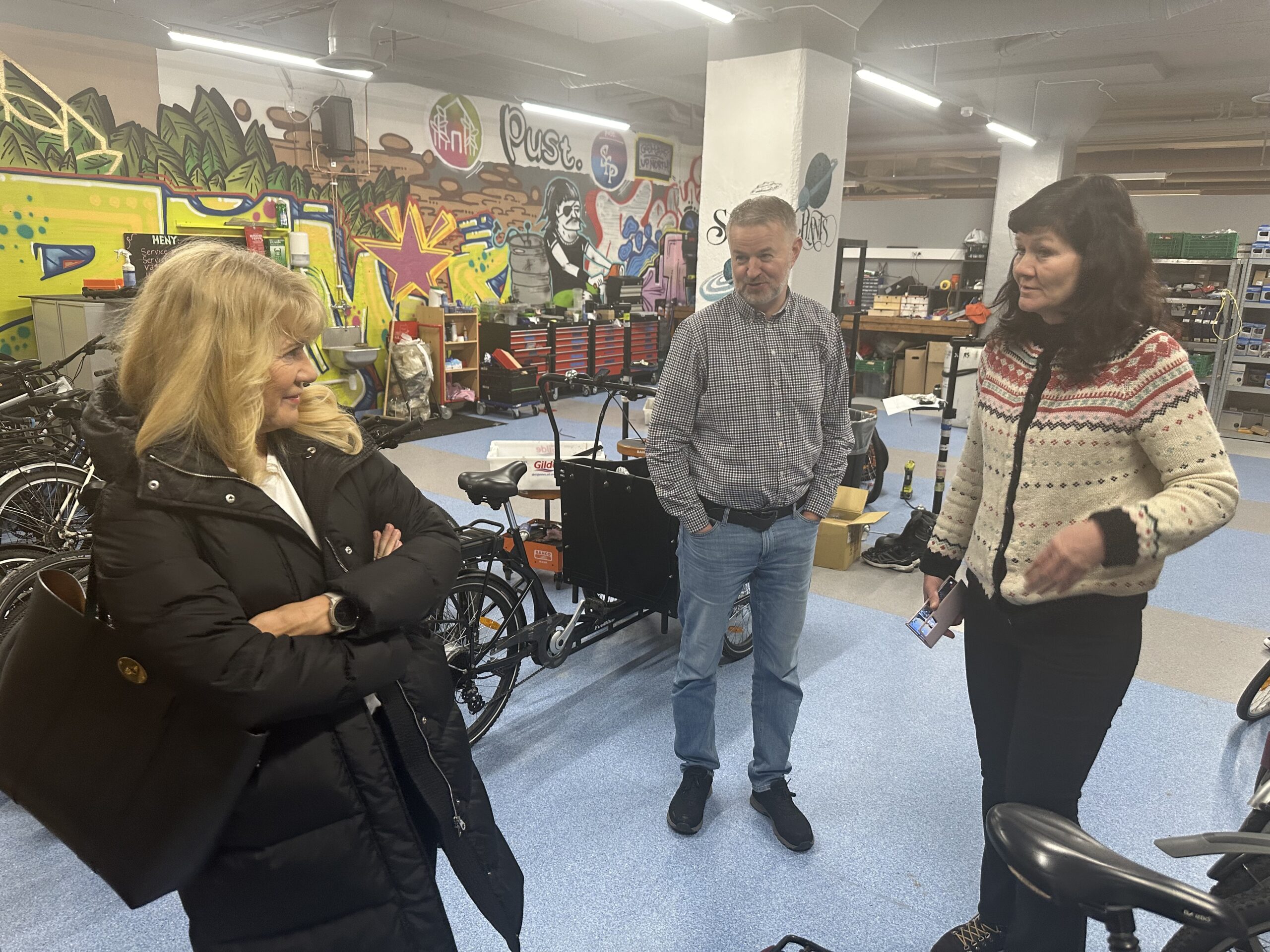 Administrerende direktør i Nobl, Mona Liss Paulsen får omvisning i det nye sykkelverkstedet av daglig leder Lars Vestnes og salgs- og markedsansvarlig Sissel Qvam i Kirkens Bymisjon i Bodø.